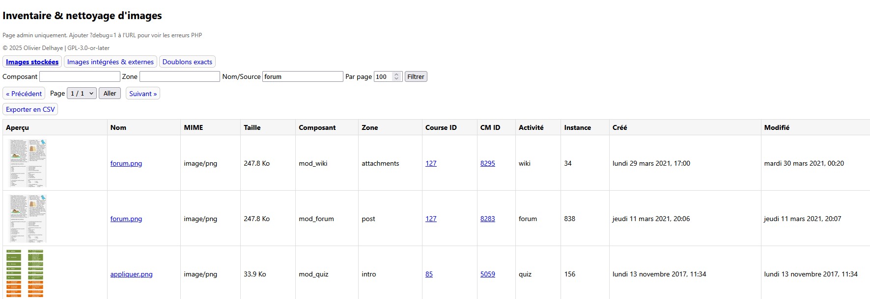 – Toutes les images stockées (avec aperçu) et leurs métadonnées clés : cours, activité (CM), module, instance, composant/zone, tailles, dates.