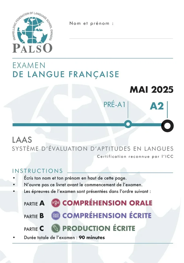 Les examens LAAS–PALSO, organisés par la Fédération panhellénique des propriétaires de centres de langues étrangères (Π.Ο.Ι.Κ.Ξ.Γ.), constituent l’un des dispositifs de certification en langues étrangères présents en Grèce. Cette page renvoie vers les sujets des sessions précédentes, utiles pour se familiariser avec le format des épreuves.