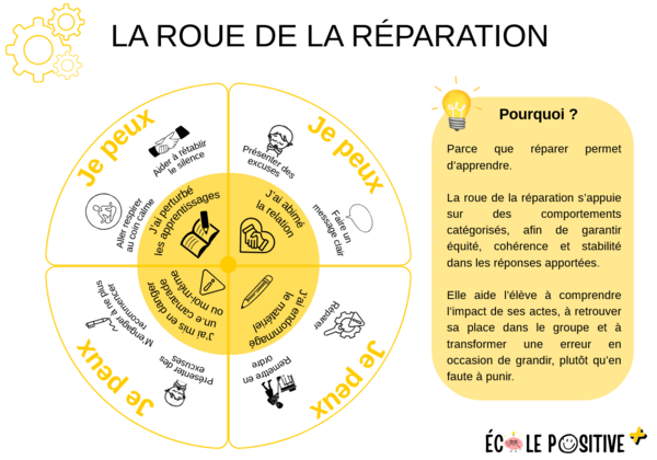 Cet outil propose une alternative claire à la sanction punitive : il vise à aider l’élève à comprendre l’impact de ses actes, à réparer ce qui peut l’être, à retrouver sa place dans le groupe et à transformer une erreur en occasion d’apprentissage plutôt qu’en faute à expier.